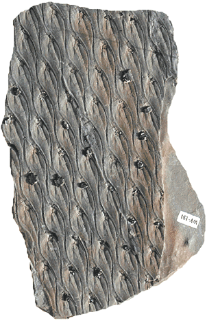 This is the outside bark of a species of ancestral trees known as Lepidodendron . It was found on a ridgetop in the pit of an active coal surface mine in Nicholas County, West Virginia in 1989.